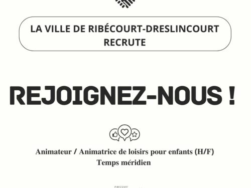 La ville de Ribécourt-Dreslincourt recrute pour son accueil de loisirs périscolaire un(e) animateur(trice) pour l'année scolaire. Sa mission ? Proposer des activités sportives, culturelles, ludiques aux 6-10 ans et les encadrer sur le temps méridien, les lundis, mardis, jeudis et vendredis....